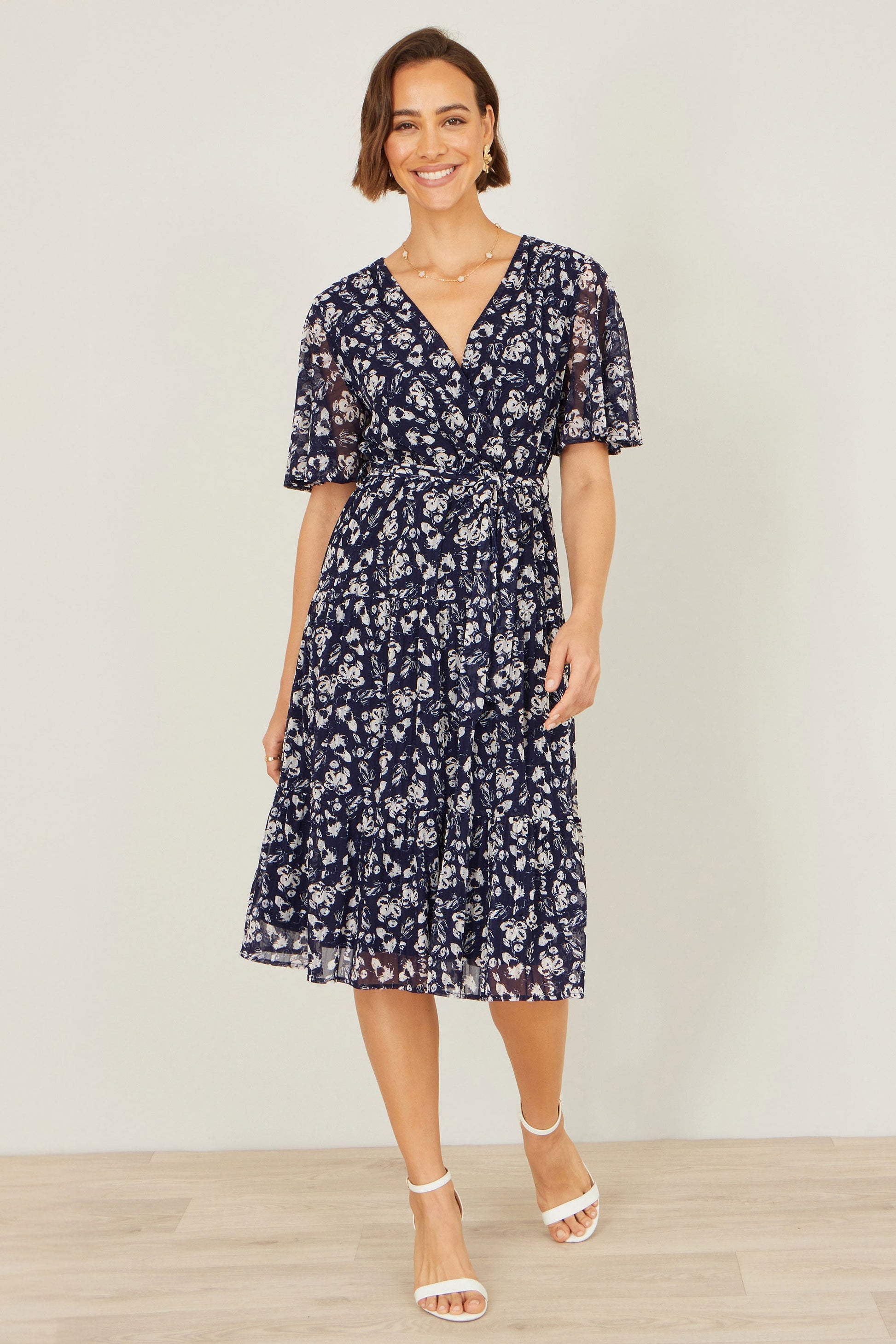 Yumi Navy Floral Mesh Wrap Dress
